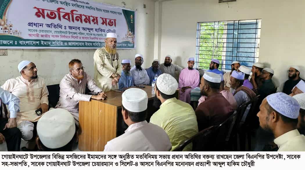 সিলেট জেলা বিএনপির উপদেষ্টা, সাবেক সহ-সভাপতি, গোয়াইনঘাট উপজেলা পরিষদের সাবেক চেয়ারম্যান ও সিলেট-৪ আসনে (গোয়াইনঘাট, জৈন্তাপুর ও কোম্পানীগঞ্জ) বিএনপির মনোনয়ন প্রত্যাশী আব্দুল হাকিম চৌধুরী বলেছেন, ইসলামের সুমহান মর্যাদা প্রতিটি ঘরে ঘরে পৌঁছে দিতে ইমামগণ অগ্রনী ভুমিকা পালন করেন। বাংলাদেশে ইমাম ও মোয়াজ্জিমদের বেতন সন্তোষজনক নয়। বিএনপি ক্ষমতায় গেলে সামাজিক শান্তি শৃঙ্খলা ও উন্নয়নমূলক কর্মকাÐ ইমামদের সম্পৃক্ত করা হবে। ইমাম ও মোয়াজ্জেমদের সম্মানজনক বেতন ভাতা নিয়ে সরকারের কাছে জোরালো দাবী জানানো হবে।